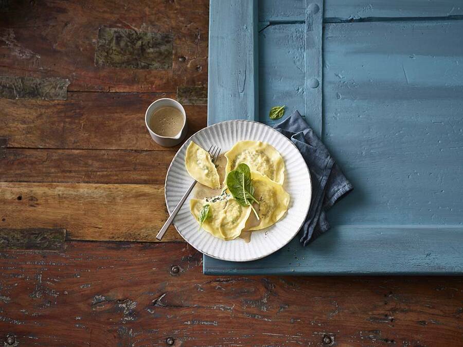 - Porter à ébullition une grande quantité d’eau salée. Y faire cuire les ravioles pendant environ 1,5 minute. Répartir la sauce dans des assiettes creuses. Retirer les ravioles de l’eau à l’aide d’une écumoire et les répartir sur les assiettes. Arroser à volonté d’un peu d’huile d’olive et servir immédiatement.